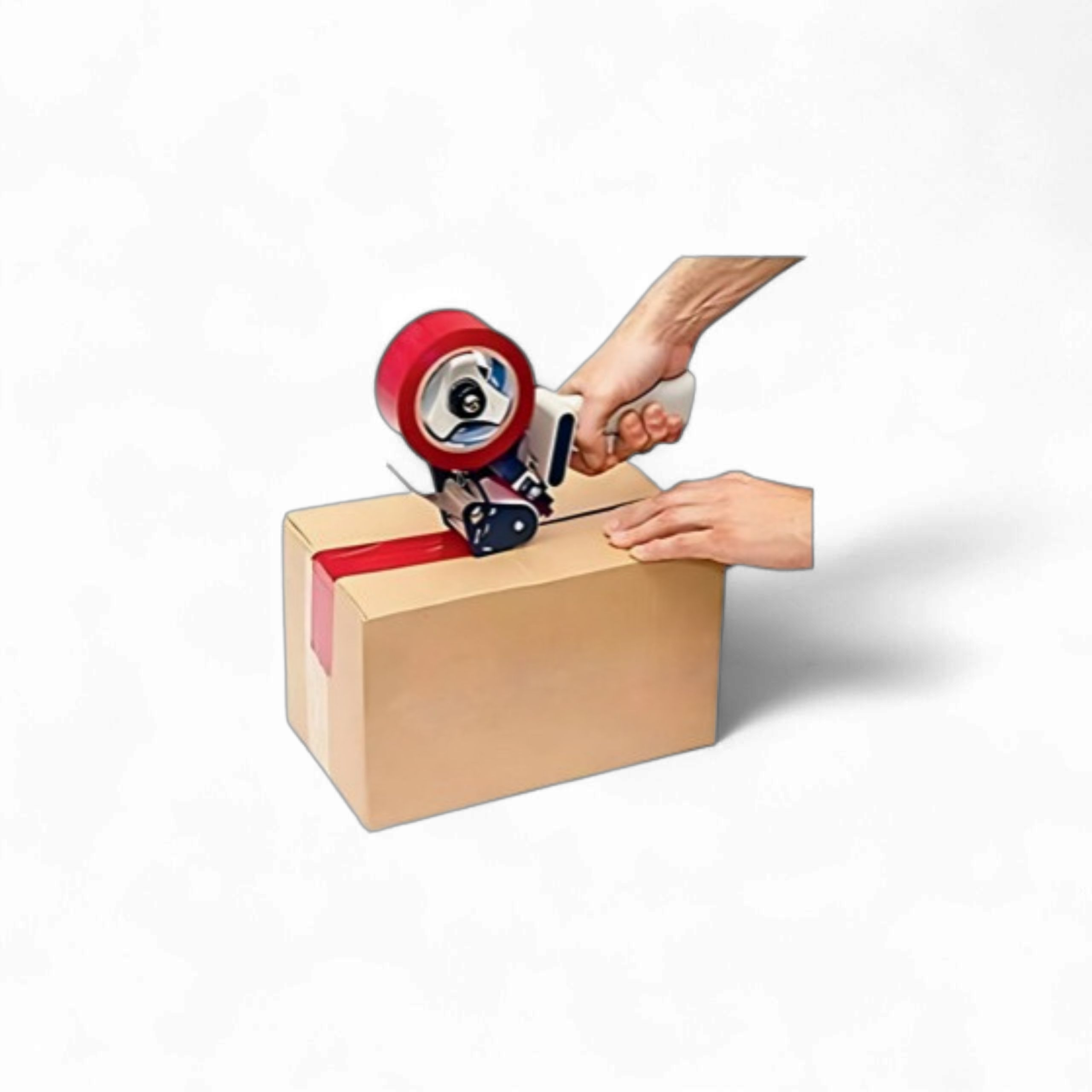 A simple, handheld tool used for sealing boxes with adhesive tape.