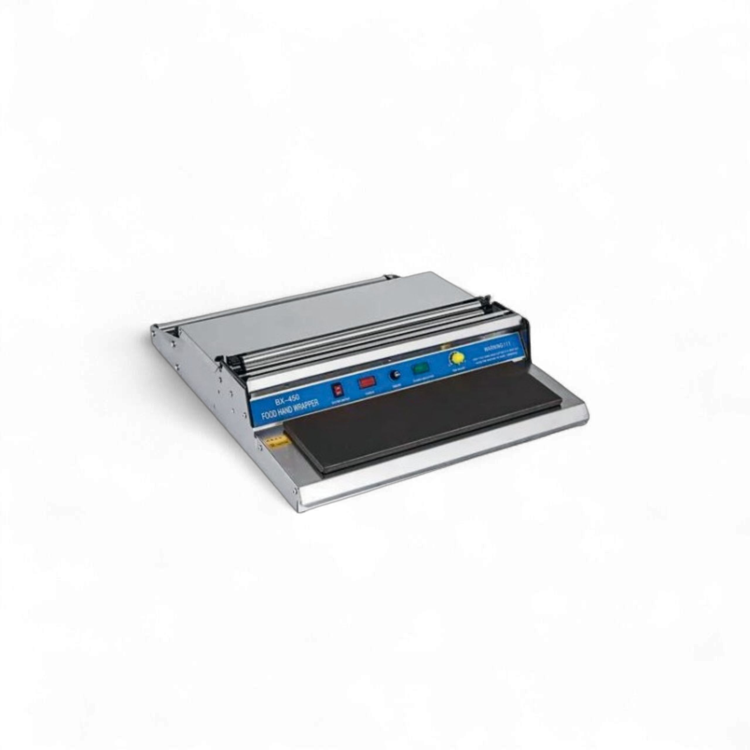 A manual machine used for wrapping trays or containers with cling film—commonly used in food packaging.