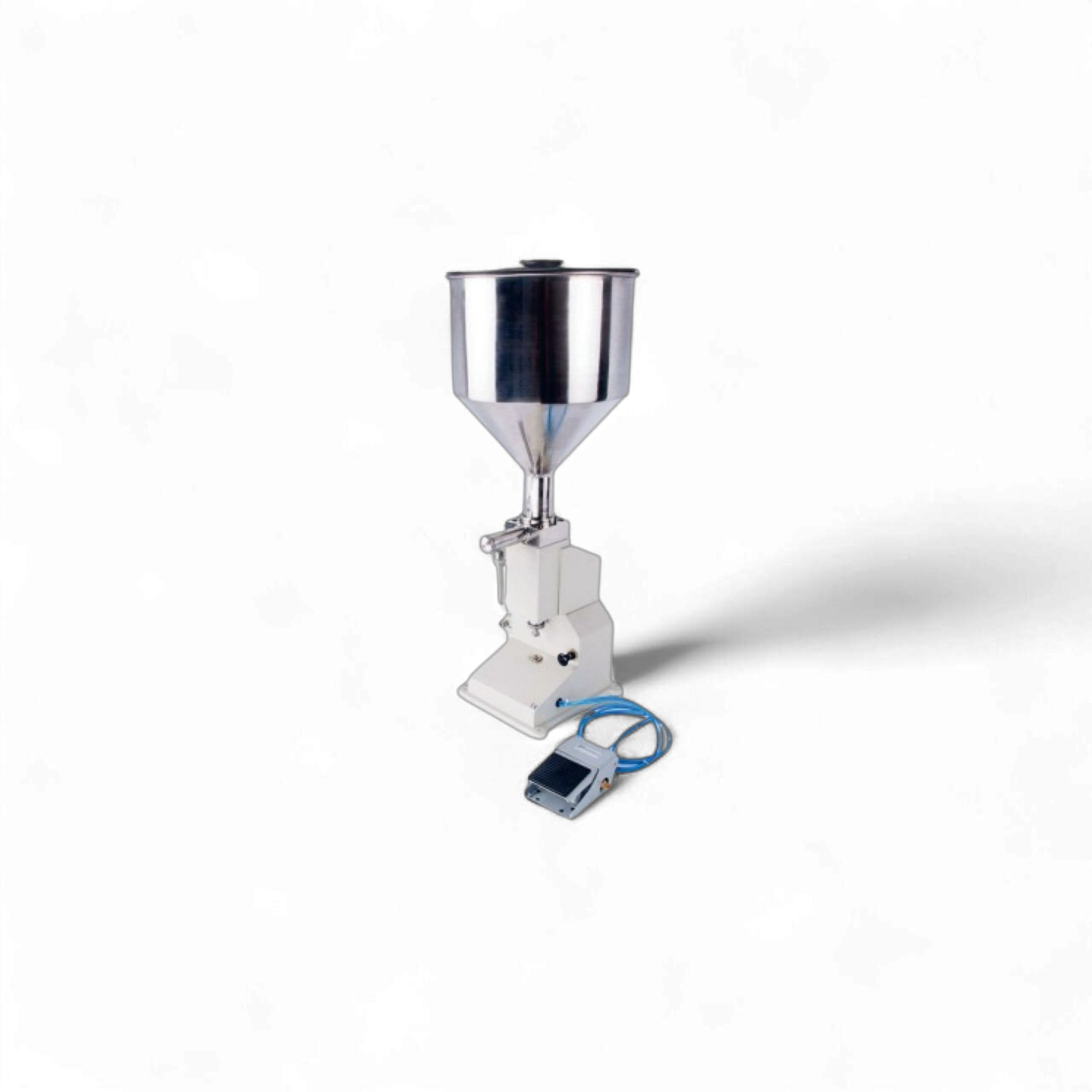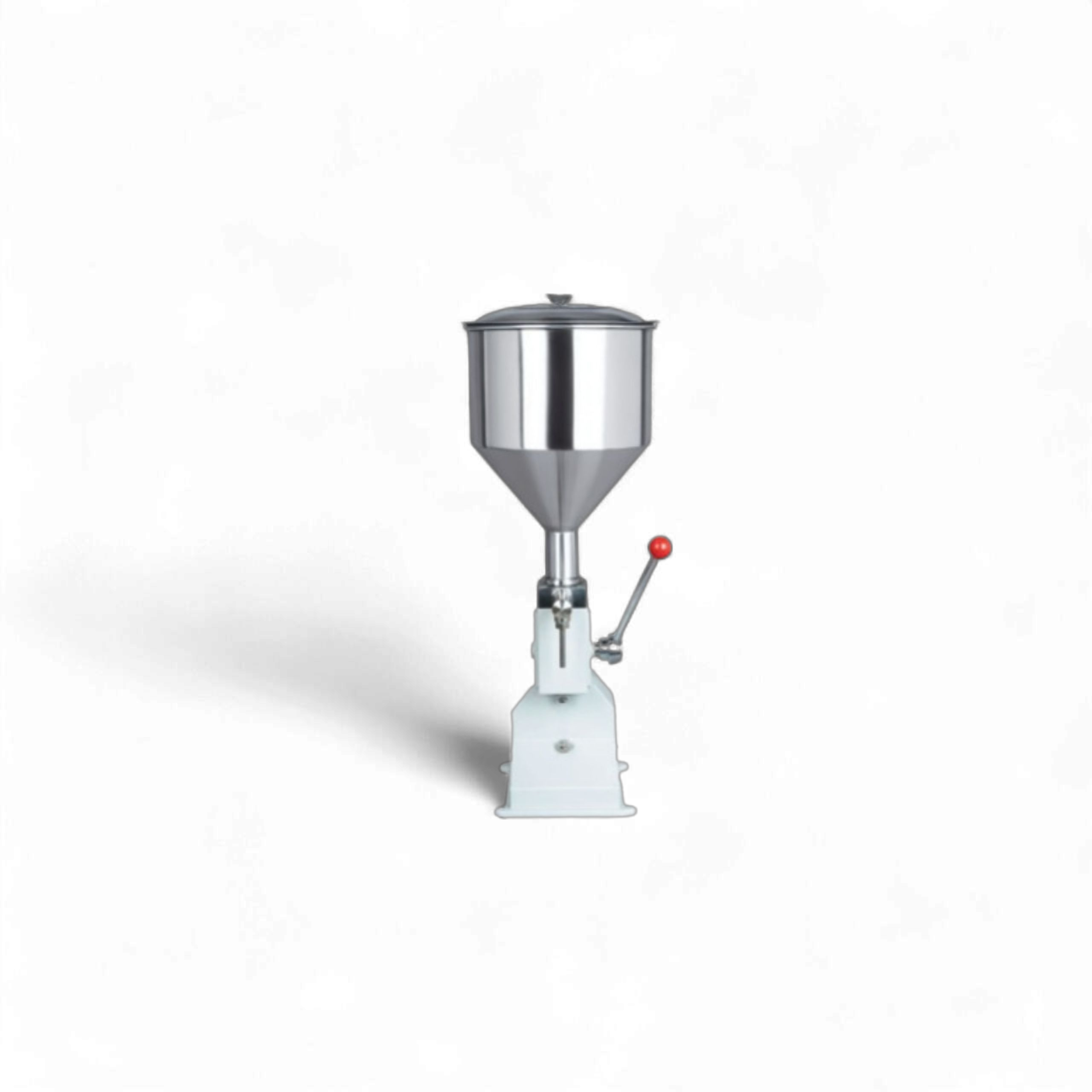 Hand-operated unit for small-scale filling of viscous products like creams or sauces.