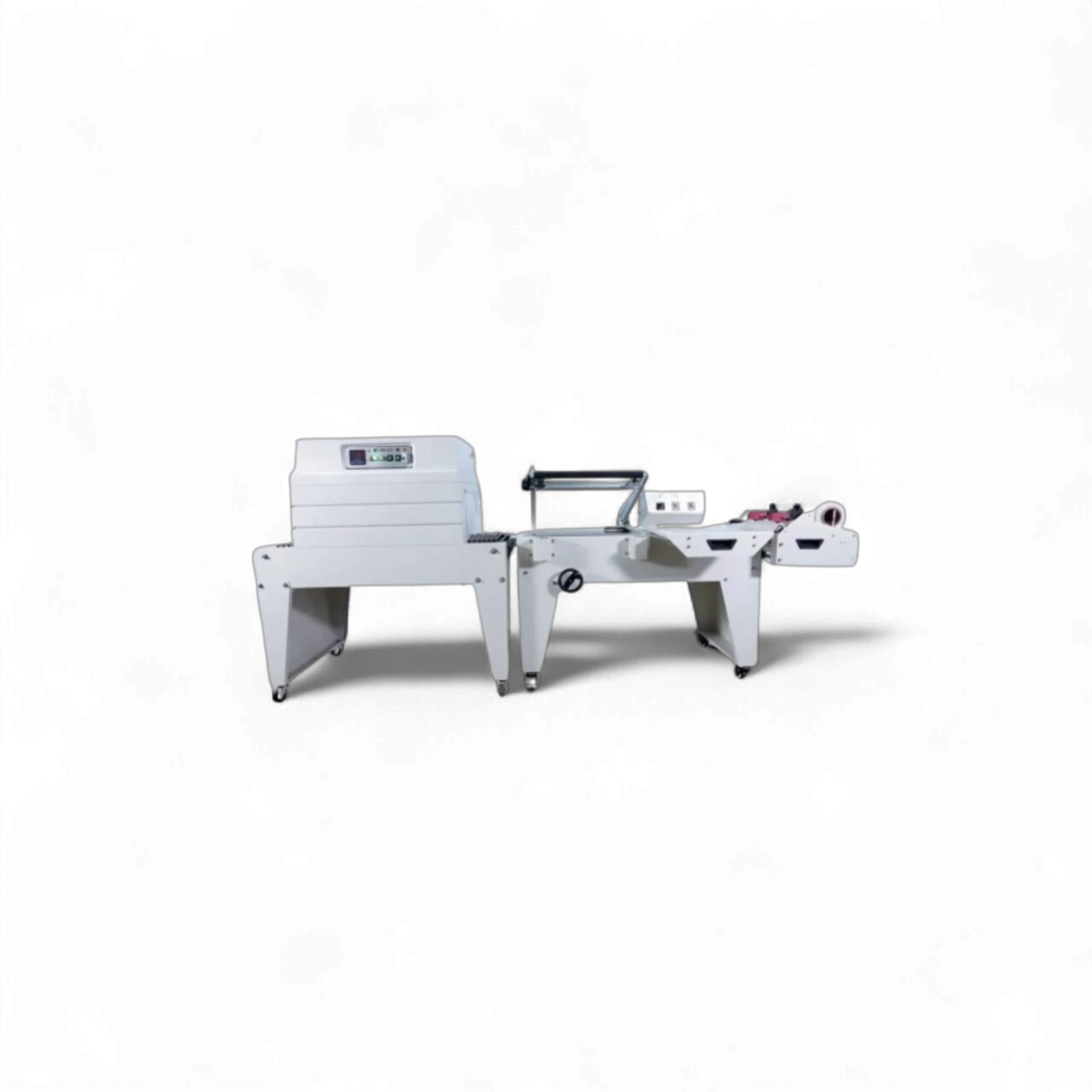 L-shaped sealing combined with a shrink tunnel to pack items in plastic film—used widely for electronics, cosmetics, and bundled goods.